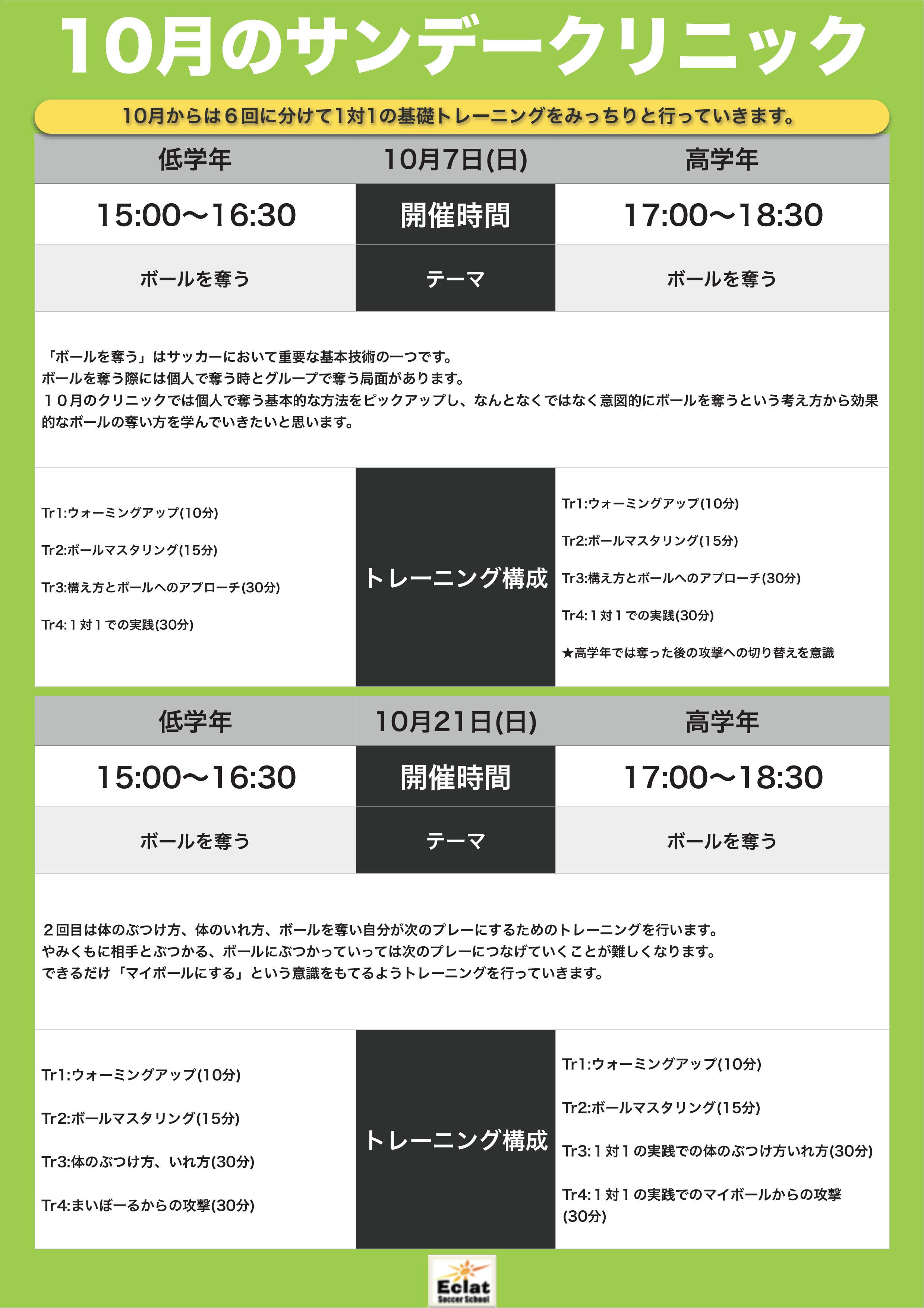 2018年10月 小学生の公開サッカー教室「サンデークリニック」 7日・21日 開催