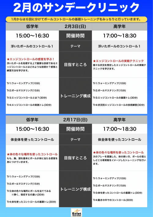2019年2月 小学生の公開サッカー教室「サンデークリニック」 3日・17日 開催