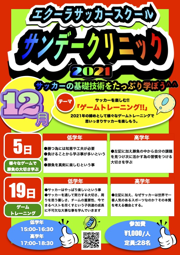 2021年12月 小学生の公開サッカー教室「サンデークリニック」 5日・19日開催