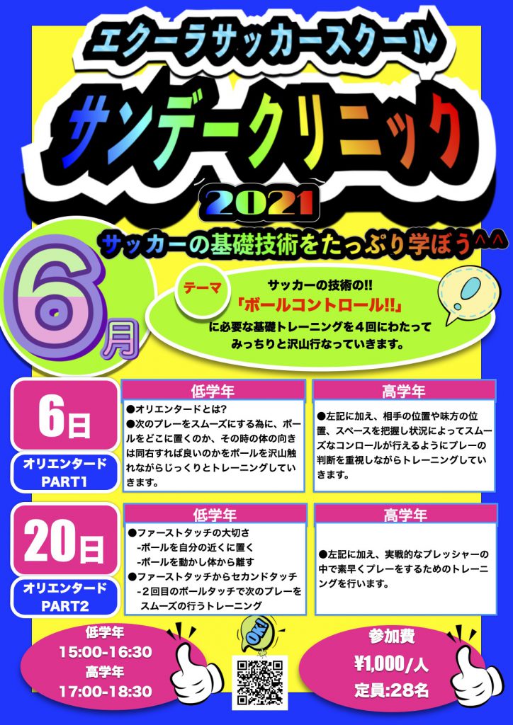 2021年6月 小学生の公開サッカー教室「サンデークリニック」 6日・20日開催
