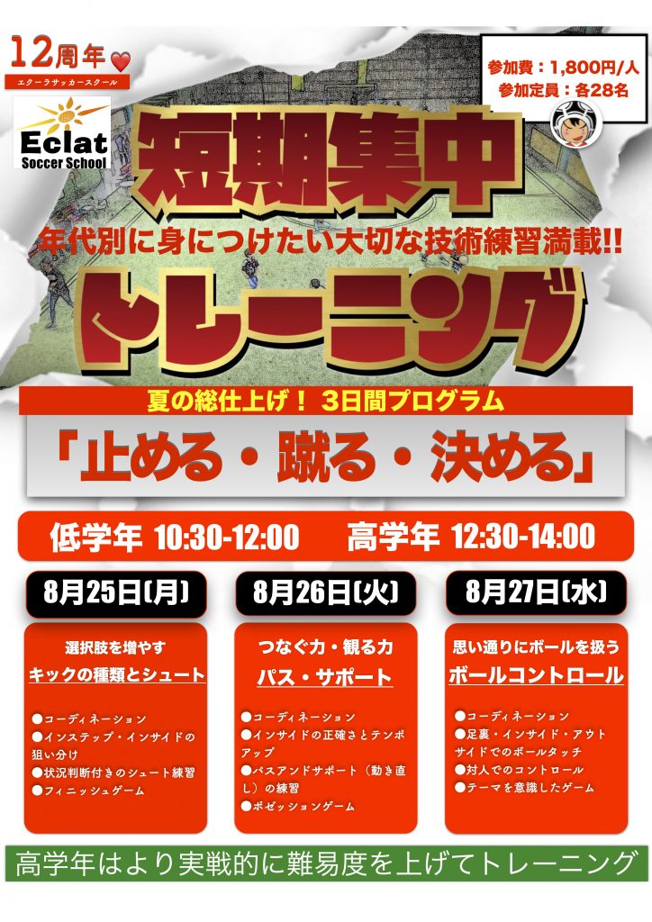 『8月25日(月)・26日(火)・27日(水)開催!短期集中トレーニング』 各テーマに様々なトレーニングでサッカーをより理解し楽しみ、サッカーの素晴らしさを思いっきり体感しながらサッカーの個人技術を高めます!! な […]