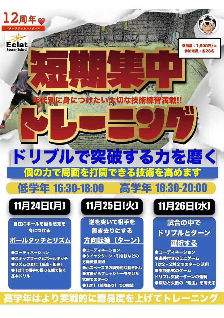 『11月24日(月)・25日(火)・26日(水)開催!短期集中トレーニング』 各テーマに様々なトレーニングでサッカーをより理解し楽しみ、サッカーの素晴らしさを思いっきり体感しながらサッカーの個人技術を高めます!! […]