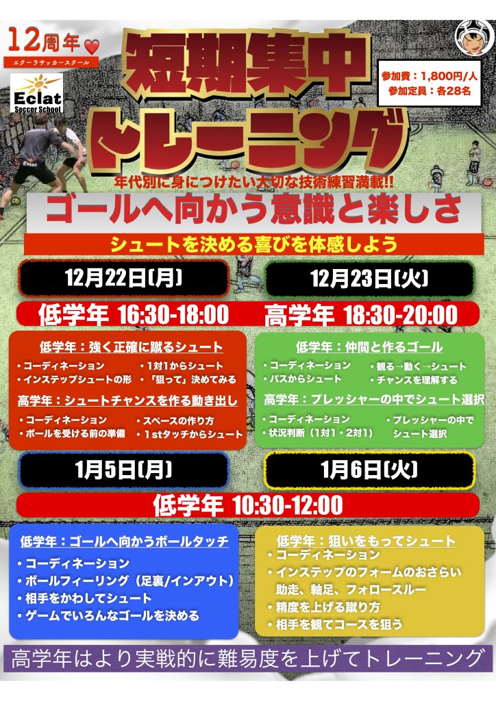 『12月22日(月)・23日(火)、1月5日(月)・6日(火)開催!短期集中トレーニング』 各テーマに様々なトレーニングでサッカーをより理解し楽しみ、サッカーの素晴らしさを思いっきり体感しながらサッカーの個人技術を […]